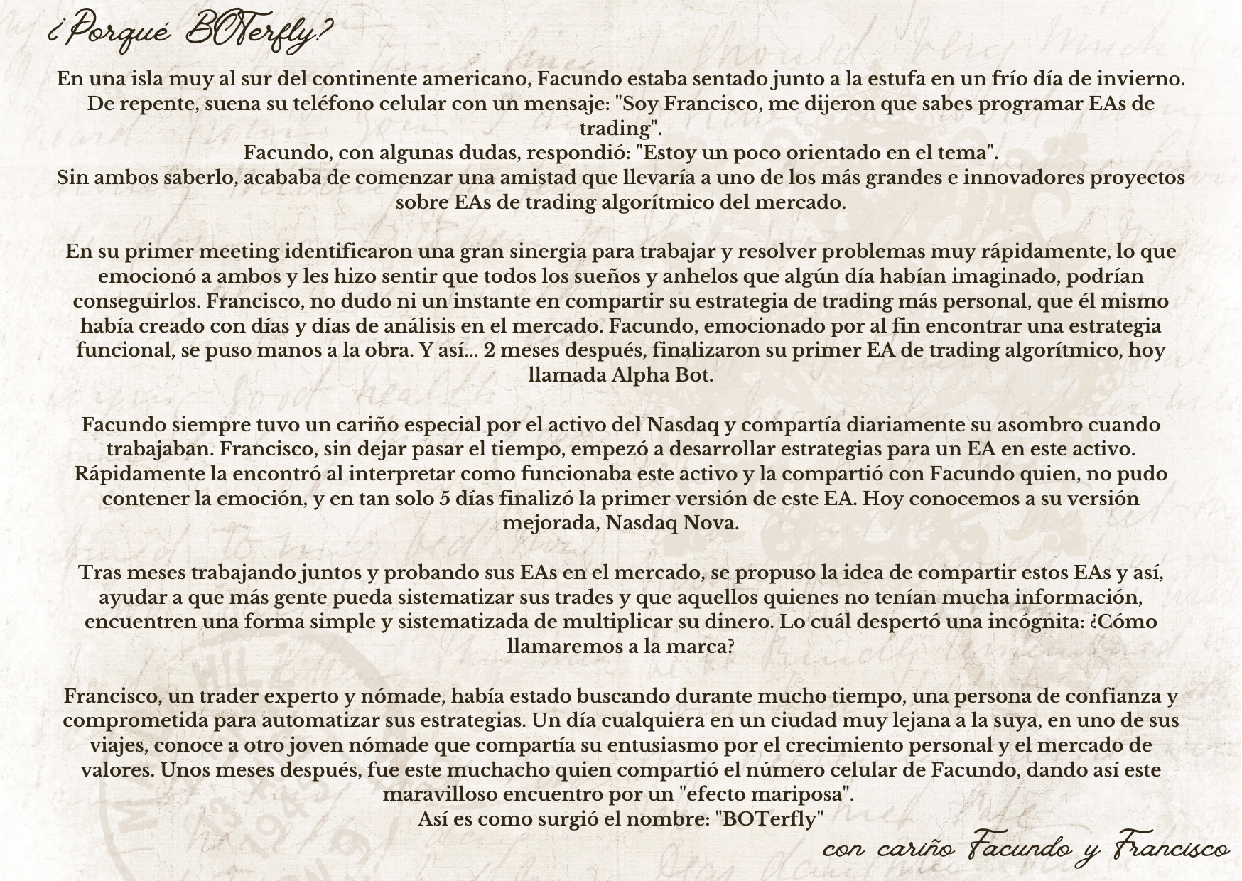 Toda la información proporcionada en este sitio no sirve en modo alguno como recomendación específica de inversión, análisis de oportunidades de inversión o recomendación general similar en relación con el trading de instrumentos financieros. BOTerfly sólo ofrece servicios y productos relacionados con EAs. La información contenida en este sitio no está dirigida a residentes en ningún país o jurisdicción en los que dicha distribución o utilización sea contraria a las leyes o normativas locales. La marca BOTerfly no actúa como brokers y no acepta depósitos.
