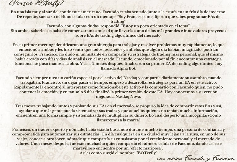 En BOTerfly, contamos con un equipo de expertos en Trading y desarrollo de algoritmos que trabajan en estrecha colaboración para diseñar y crear bots de Trading algorítmico personalizados y de alta calidad. Nuestros EAs están diseñados para operar en diferentes mercados y plataformas, incluyendo Forex, acciones, índices y criptomonedas.